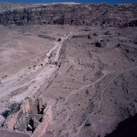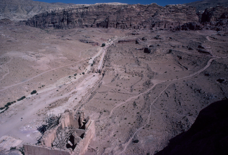 Jordan. Petra, view of Royal Tombs, colonnaded street and Qasr al-Bint