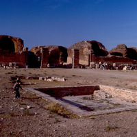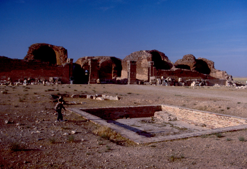Jordan. Qasr al-Mushatta, within the walls of Mushatta, a small pool and the standing remains of the triple-apsed throne room and adjacent rooms