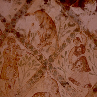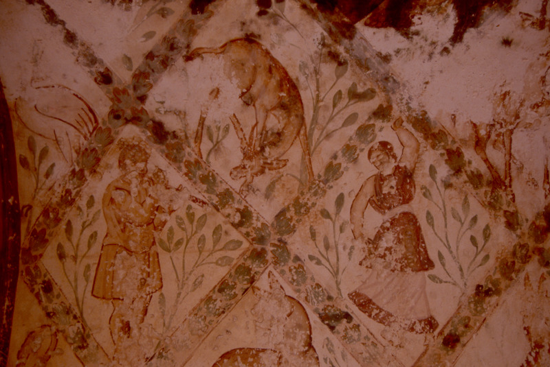 Jordan. Qusayr Amra, gipsy scenes in the ceiling of the "tepidarium". A gipsy is playing the flute, while a gipsy girl dances