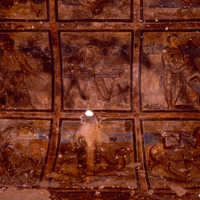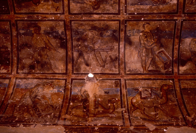Jordan. Qusayr Amra, the decoration of this aisle is completed with the caissons which show craftsman's scenes: stonemasons, carpenters, blacksmiths and masons, representing the different stages of the construction of a building