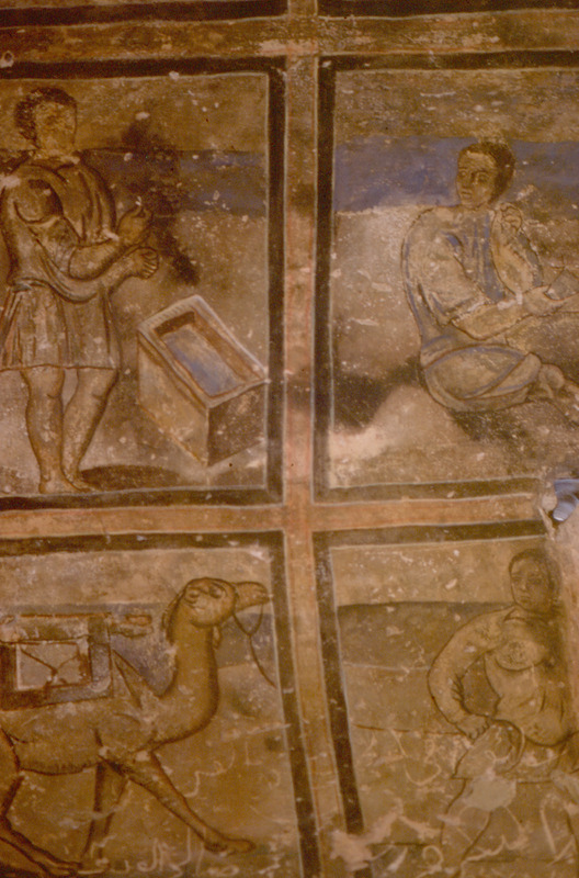 Jordan. Qusayr Amra, two caissons of the vault of the left aisle, with smithy scenes. The shading technique can be clearly observed.
