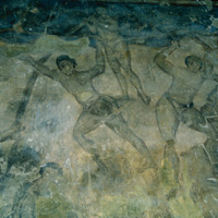 Jordan. Qusayr Amra, figure of a young man in a wrestling position in the arena scene
