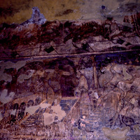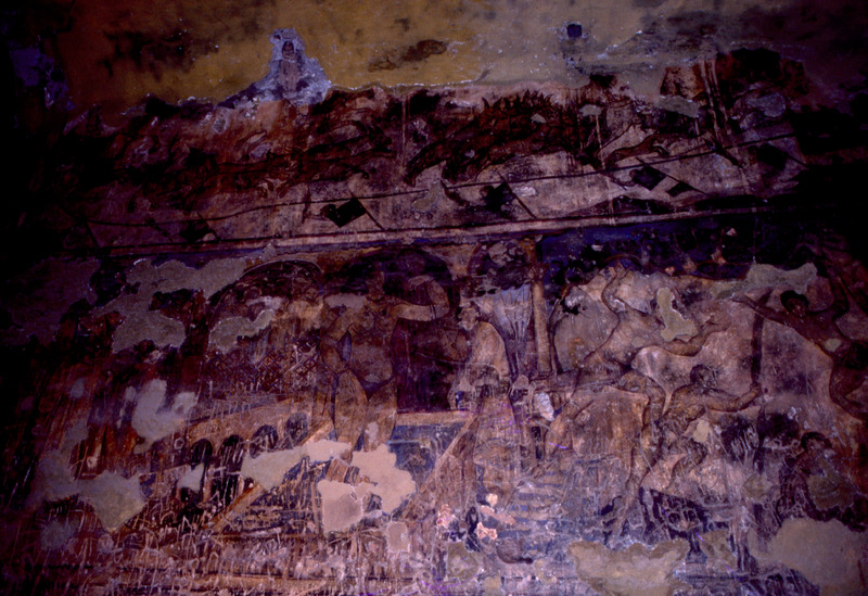 Jordan. Qusayr Amra, general view of the west wall of the right bay of the great hall, framed in the foreground by the arch that marks the entrance to his bay