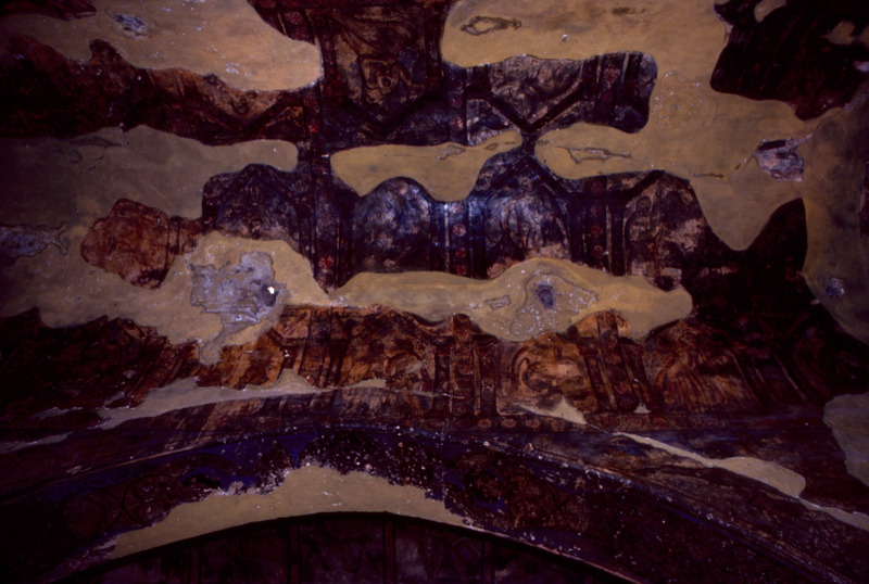 Jordan. Qusayr Amra, interior of the great hall looking towards the west. side. In the foreground at the top, some of the paintings of the central vault, and in the background, various scenes belonging to the right aisle