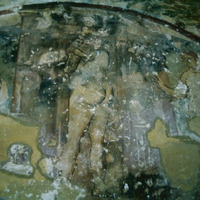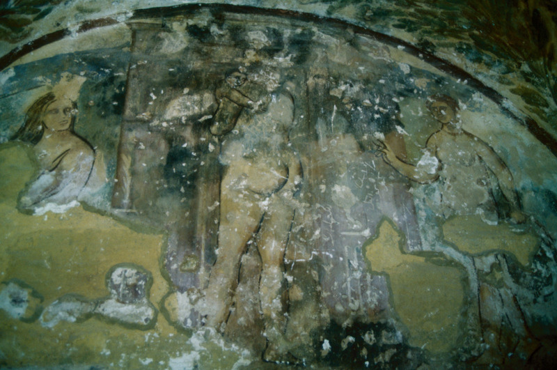 Jordan. Qusayr Amra, bathing scene with three female figures on an architectural background, the one on the right is approaching with a large vessel of hot water,while the one in the center holds a child