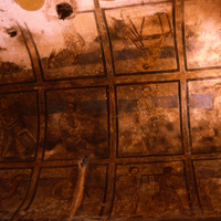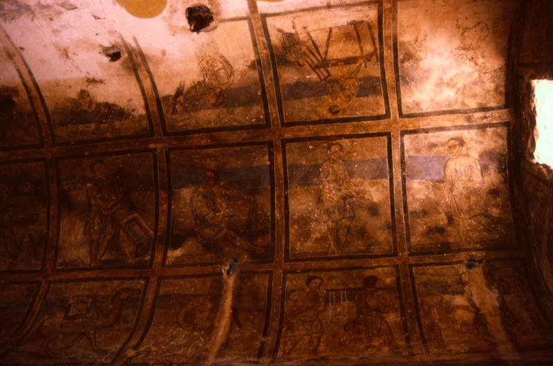 Jordan. Qusayr Amra, general view of the vault of the left bay, with artisan scenes. On the upper part, the decorative arrangement of the soffit of the arch which leads into this aisle may be observed, with the female figures holding a medallion