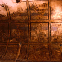 Jordan. Qusayr Amra, general view of the vault of the left bay, with artisan scenes. On the upper part, the decorative arrangement of the soffit of the arch which leads into this aisle may be observed, with the female figures holding a medallion