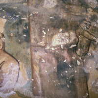 Jordan. Qusayr Amra, detail of a female figure holding a child on the S. tympanum of the women's "caldarium"