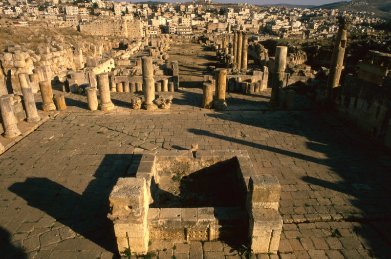 Jordan. Jerash, The Fountain Court with the ruins of the Cathedral beyond