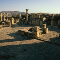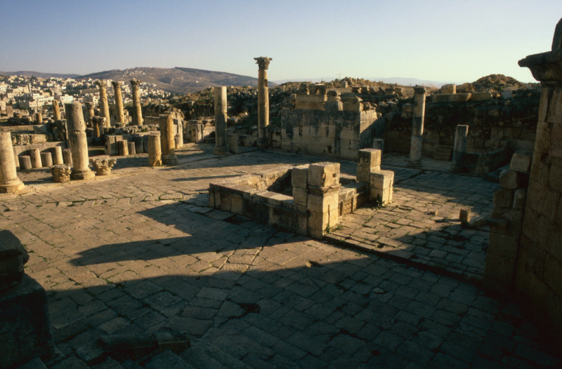 Jordan. Jerash, The Fountain Court with the ruins of the Cathedral