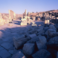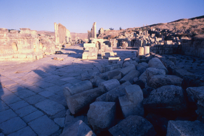 Jordan. Jerash, central section of Cardo looking north from South Tetrakionion