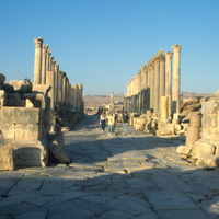 Jordan. Jerash, Colonnade Street (Cardo maximus) view from south Tetrapylon