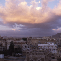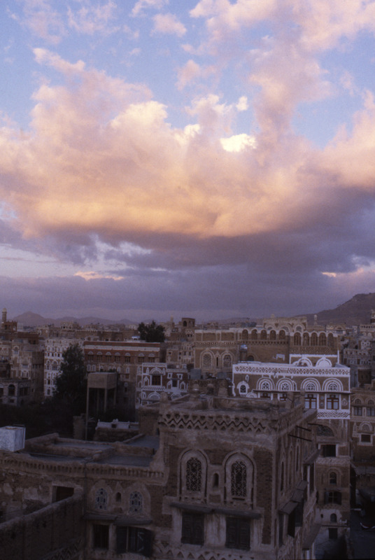 Yemen. Sana'a, sunset clouds & houses