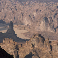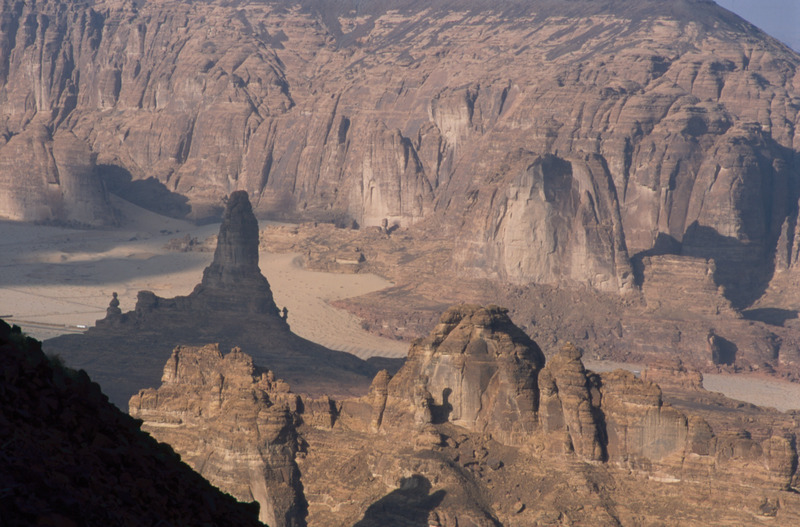 Saudi Arabia. Al-Ula, view north over wadi and mountains from Jabal Harra