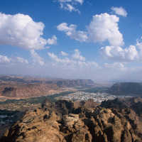 Saudi Arabia. Al-Ula, view south over town, wadi and mountains from Jabal Harra
