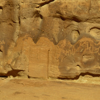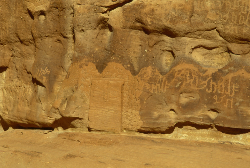Saudi Arabia. Mada'in Saleh, Jabal Ethlib, 'eye' idol and Nabataean inscription