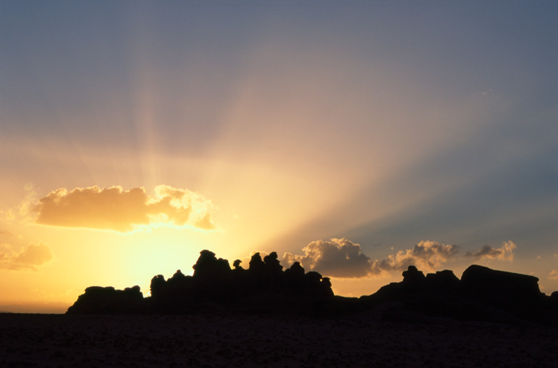 Saudi Arabia. Mada'in Saleh, sun setting behind Jabal Ethlib