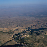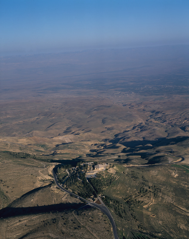 Mount Nebo, Memorial of Moses, from west, Jordan Valley in background
