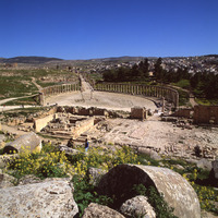 Jordan. Jerash, Temple of Zeus, Hellenistic Temple / Roman altar and Oval Piazza behind