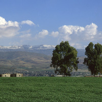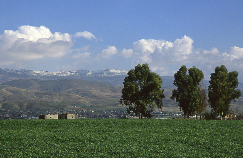 Jordan Valley in spring view east snow on Ajlun hills