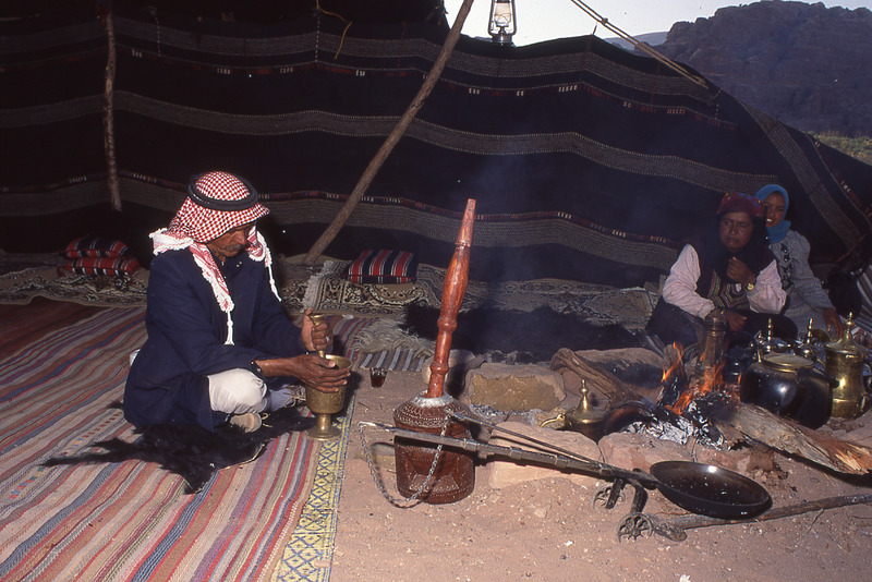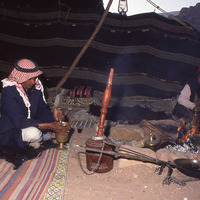 Petra, bedouin tent, Dakhilallah grinds coffee in majlis