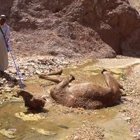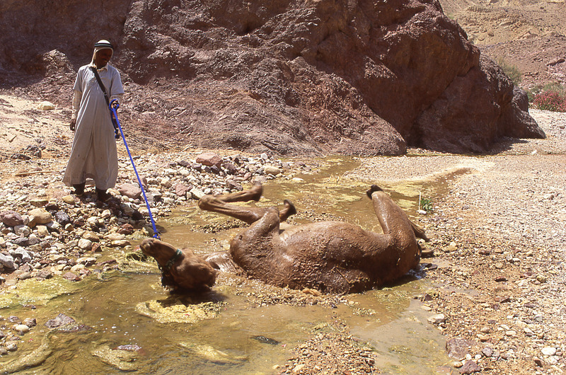Camel trek, camel wallows in stream at Tur Imdai