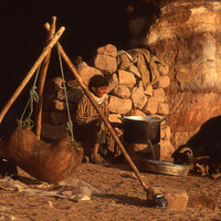 Petra, Bdoul bedouin woman making cheese in goatskin