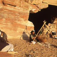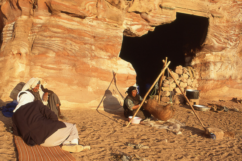 Petra, Bdoul bedouin woman making butter in goat skin; Mughar an-Nasara