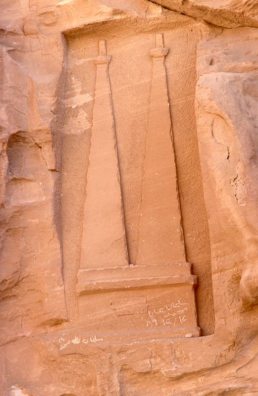 Petra, Siq Umm al Alda (or Siq Umm al Hiran) north of Petra. Twin obelisks cut into rock face