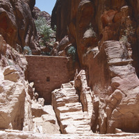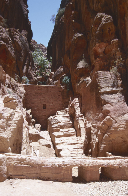 Petra, Siq new dam in Wadi al-Qantara and steps to shrine