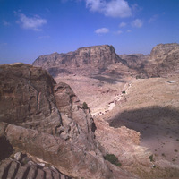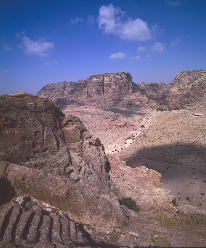 Petra basin from al-Khubtha (include back of Palace Tomb) to Qasr al-Bint and mountains behind