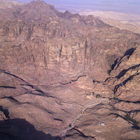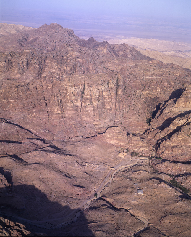 Petra basin from Jabal al-Khubtha to Qasr al-Bint, over mountains. to Wadi Araba