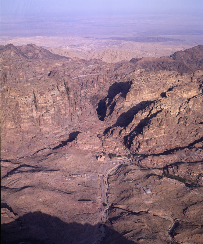 Petra basin from Jabal al-Khubtha to Qasr al-Bint, over mountains. to Wadi Araba