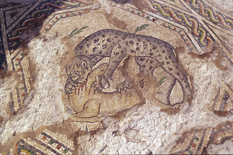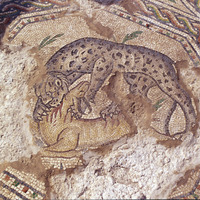 Qastal, mosaic leopard attacking antelope, Umayyad, eighth century