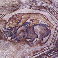 Qastal, mosaic of lion attacking bull, Umayyad, eighth century