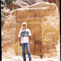 Petra - Man posing in front of betyl in the Siq