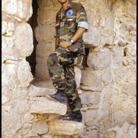 A military man climbs the cantilevered stairs in a house in the village of Samra