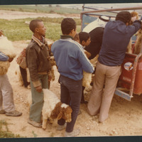 Children loading goats into a truck