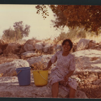 Unidentified woman sitting next to buckets
