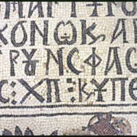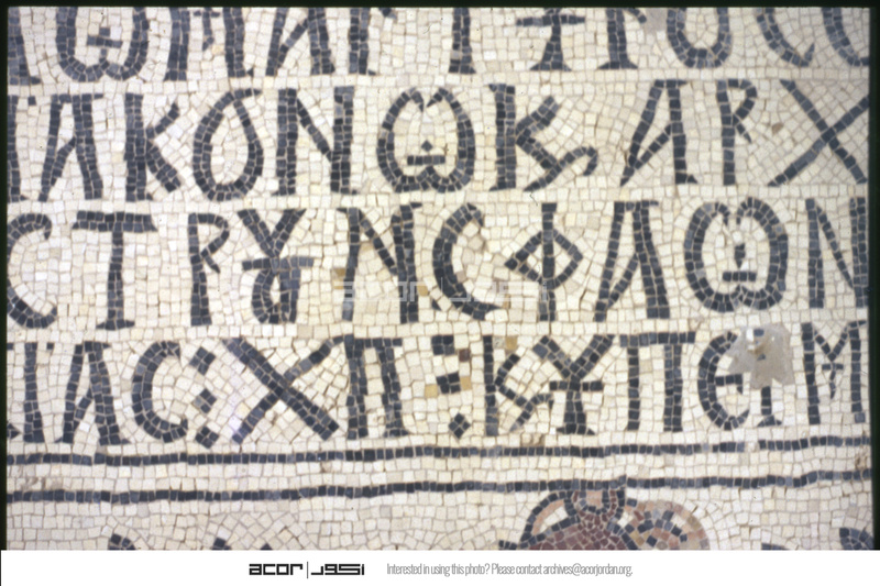 Umm al-Rasas - Detail of Greek inscription in mosaic in Church of St. Stephen