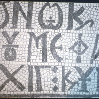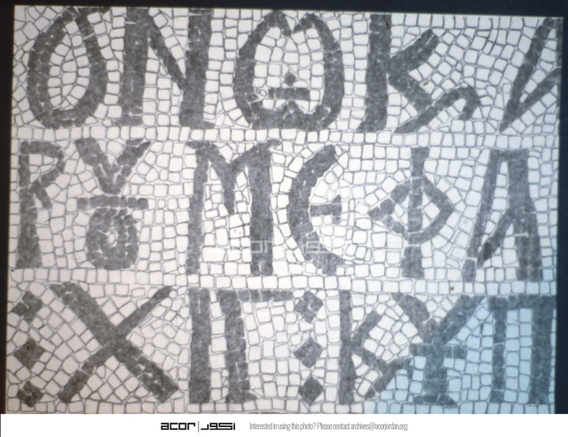 Umm al-Rasas - Detail of Greek inscription in mosaic in Church of St. Stephen