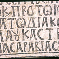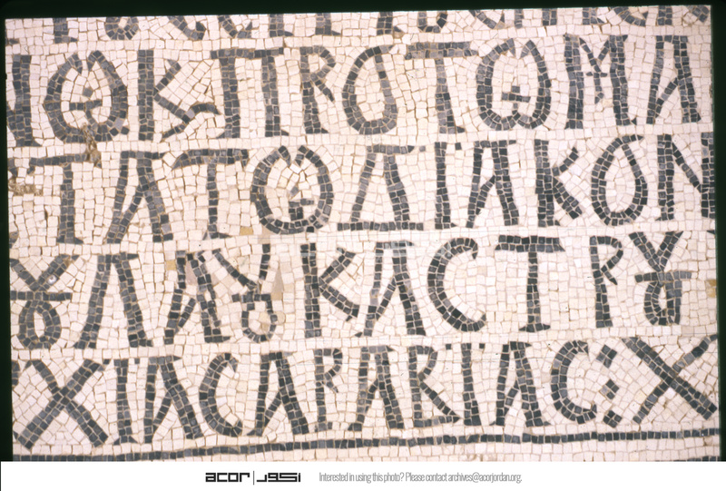 Umm al-Rasas - Detail of Greek inscription in mosaic in Church of St. Stephen