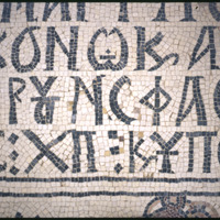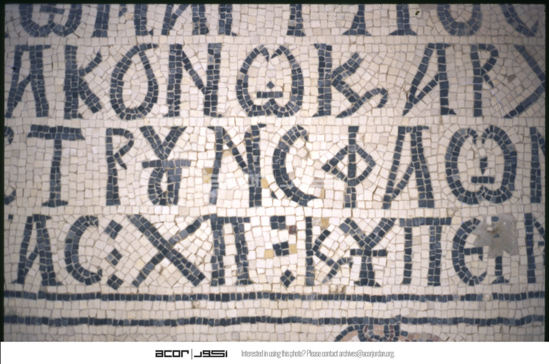 Umm al-Rasas - Detail of Greek inscription in mosaic in Church of St. Stephen