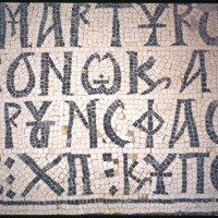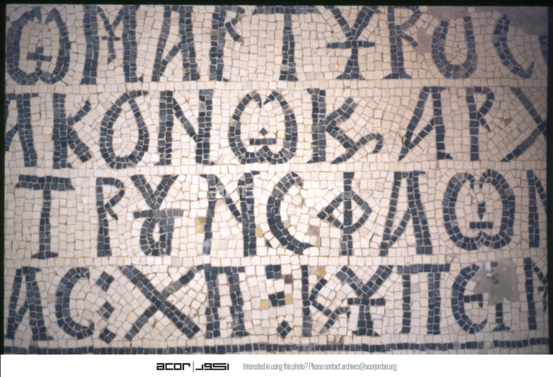 Umm al-Rasas - Detail of Greek inscription in mosaic in Church of St. Stephen
