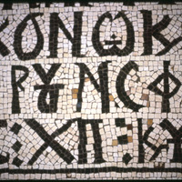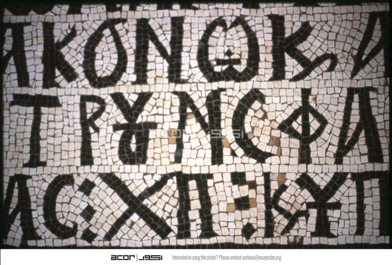 Umm al-Rasas - Detail of Greek inscription in mosaic in Church of St. Stephen