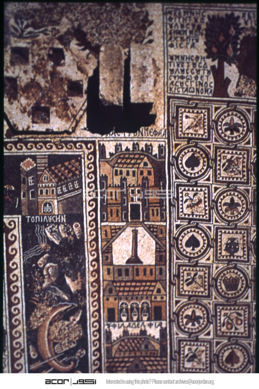 Umm al-Rasas - Church of St. Stephen, floor mosaic with Kastron Mefa'a and floral mosaics