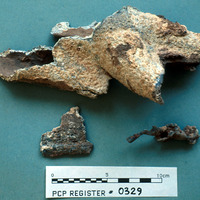 Fragment of lead pipe, distorted from original shape; lead - Sq. F2. Loc. 22