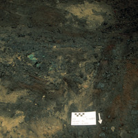Cu alloy door hinge. Close-up view to south. - Sq. B2. Locus 14/FN1.