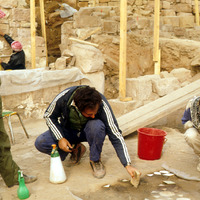 Tom, Rachel, & Hamoudi cleaning floor pieces.