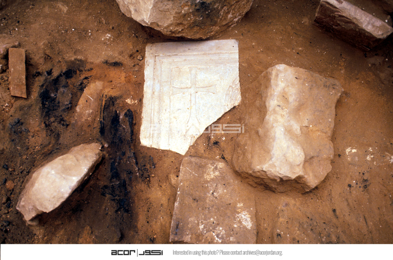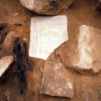 Marble w/cross. In-situ. View to north. - Sq. G4. Locus 25.